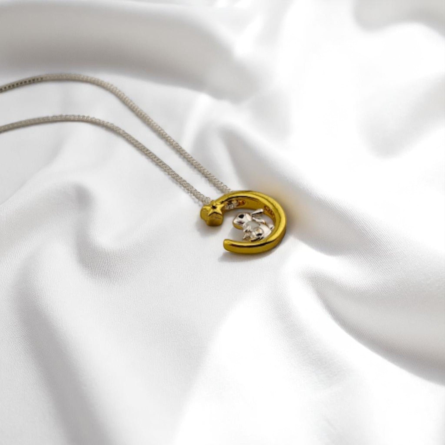 Moon bunny pendant necklace resting on soft white fabric – RossJewelrys
